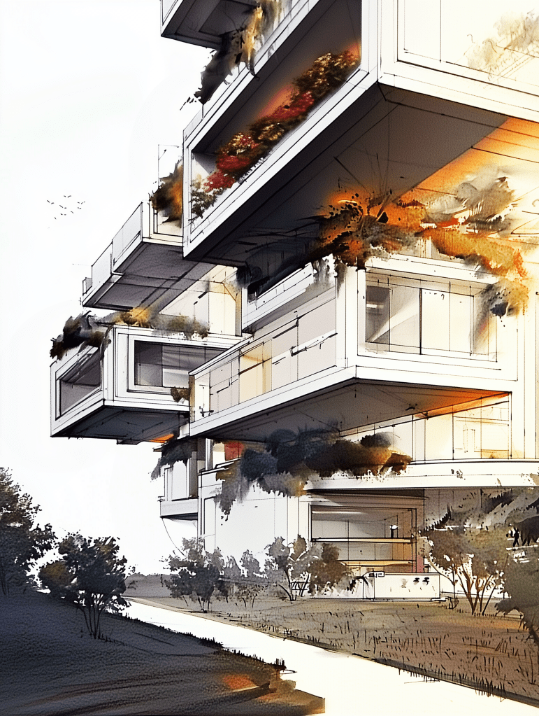 Vertical terraces could overflow with plant life, offering shade, natural cooling, and air filtration while cultivating self-sustaining microclimates within the dense urban fabric. This would not be a mere ornamental gesture toward sustainability but an imperative—architecture at last aligning with the urgency of its time.